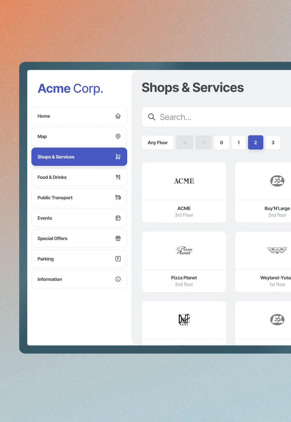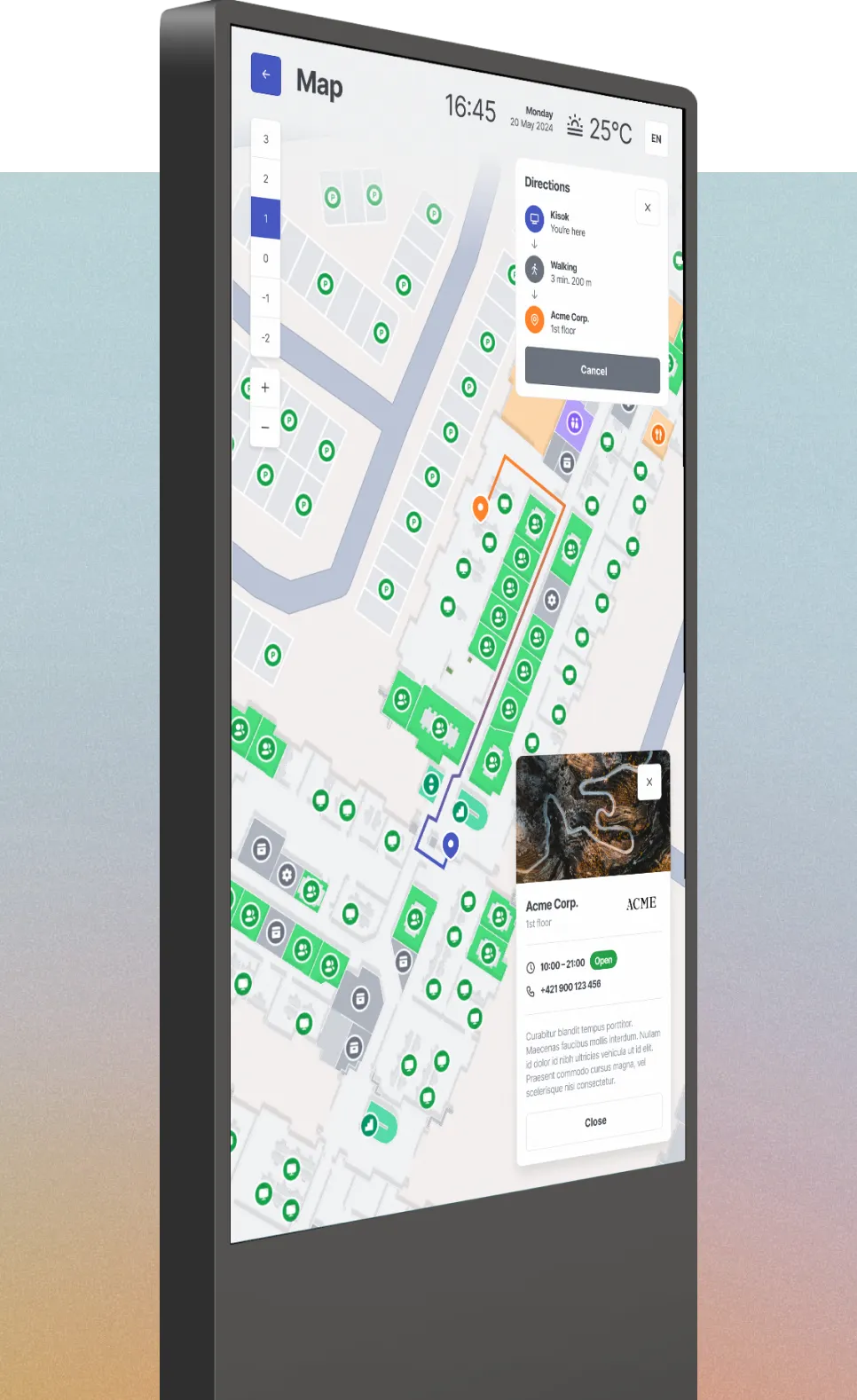 Kiosks are a vital element of your brand communication. The MapsIndoors solution lets you customize both the look of both the overall kiosk and the mall map itself and even offers multilingual support.